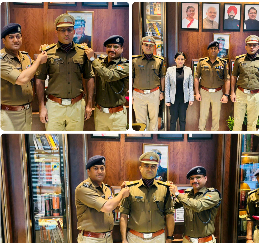 वरिष्ठ पुलिस अधीक्षक हरिद्वार द्वारा दोनों अधिकारियों के कंधों पर अशोक स्तम्भ पहना कर किया गया अलंकृत