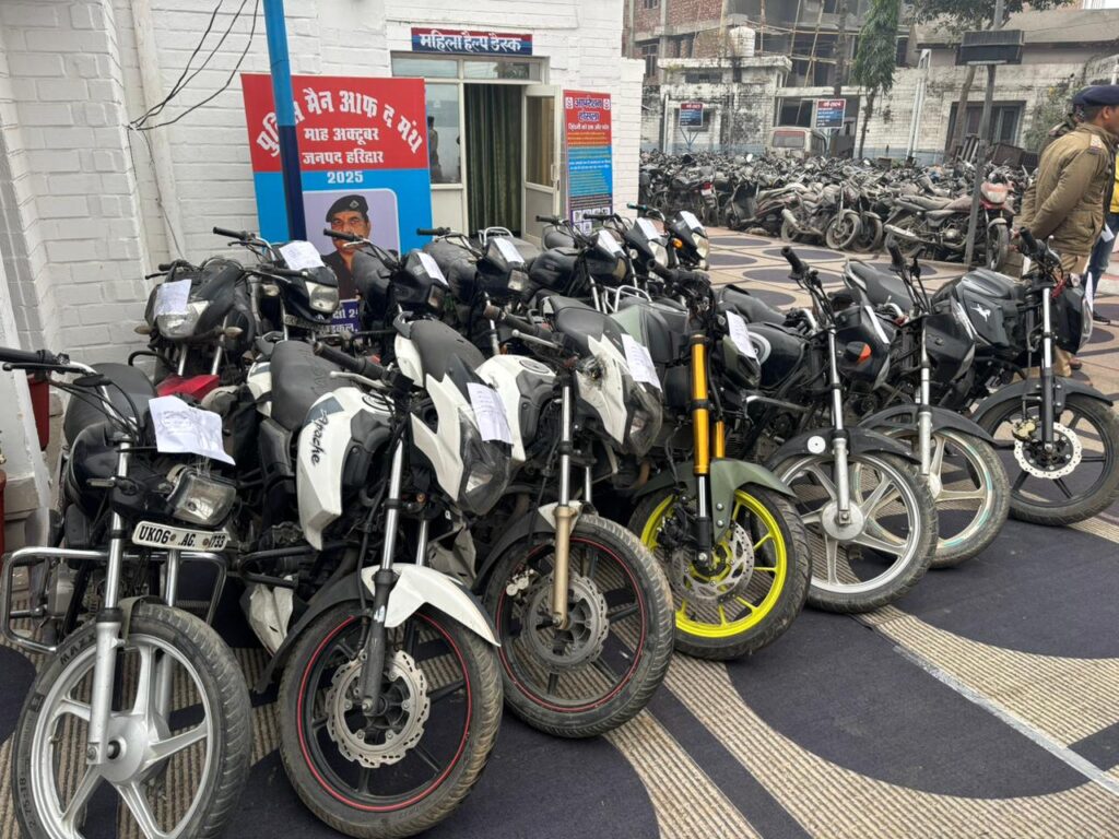 बरामद सभी मोटरसाइकिलों का निरीक्षण कर ई-चालान मशीन के माध्यम से विवरण प्राप्त किया गया, जिनमें विभिन्न जनपदों से चोरी की गई हीरो स्प्लेंडर, सुपर स्प्लेंडर, TVS अपाचे, यामाहा MT-15, TVS राइडर एवं HF डीलक्स मोटरसाइकिलें शामिल हैं।