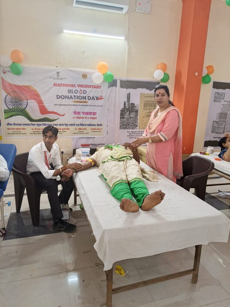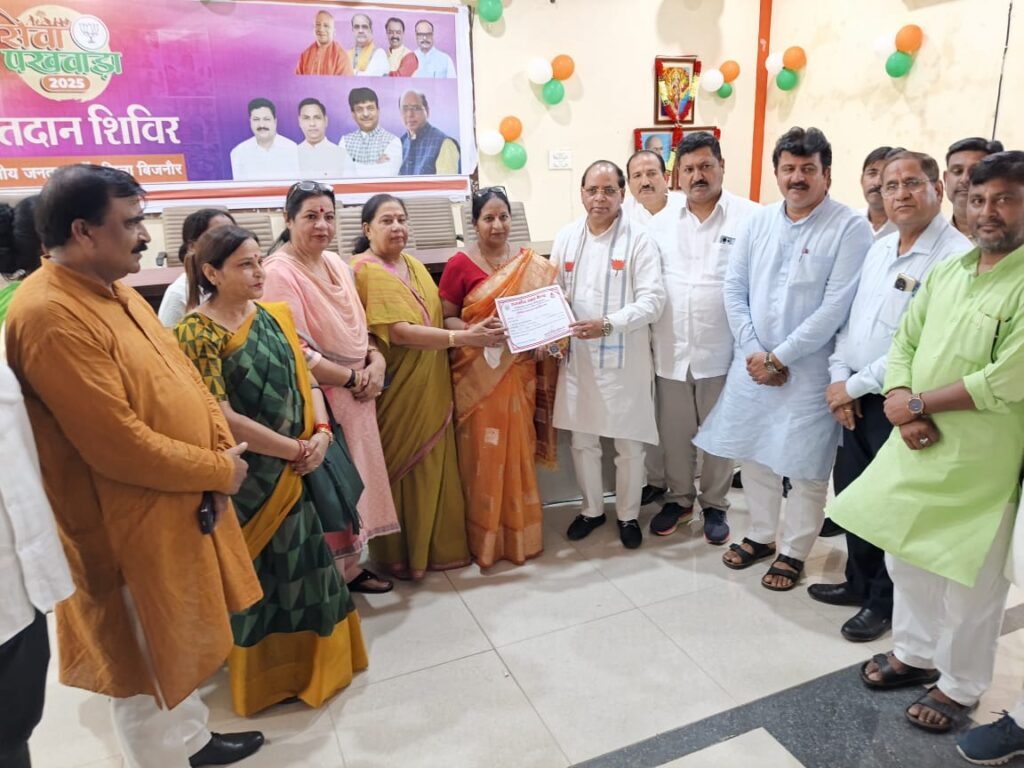 बिजनौर। देश के प्रधानमंत्री नरेंद्र मोदी जी के जन्मदिन पर सेवा पखवाड़ा अभियान जिला कार्यालय पर चलाया गया। भाजपा कार्यकर्ताओं ने सेवा पखवाड़ा के अंतर्गत रक्त दान किया किरतपुर से वरिष्ठ नेत्री क्षेत्रीय शोध विभाग प्रमुख रजनी कालरा जी के साथ रुक्मिणी व लक्ष्मी, मोनिका कालरा निशी शर्मा आदि कार्यकर्ताओं ने रक्तदान किया। जिसमें क्षेत्रीय अध्यक्ष आदरणीय सत्येंद्र सिसोदिया जी व जिला अध्यक्ष आदरणीय भूपेंद्र चौहान जी ने बहनों को रक्तदान करने पर प्रशस्ति पत्र देकर सम्मानित किया