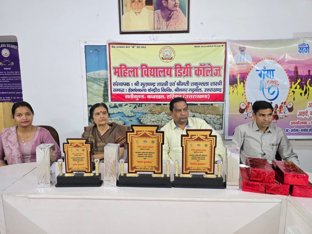 आज दिनांक 04/11/2025 को गंगा उत्सव-2025 के उपलक्ष् में महिला विदयालय डिग्री कॉलेज, सतीकुंड कनखल हरिद्वार में नमामि गंगे और उत्तराखंड जल संस्थान हरिद्वार के सहयोग से शीर्षक गंगा संरक्षण एवं स्वच्छता पर चित्रकला / स्लोगन प्रतियोगिता का आयोजन किया गया। जिनमें सभी छात्राओं ने मनोयोग से प्रतिभाग किया। महाविद्यालय की प्राचार्या प्रो० गीता जोशी सहित कार्यक्रम के आयोजक अनुरक्षण शाखा (गंगा) उत्तराखंड जल सस्थान जगजीतपुर,हरिद्वार के अधिशासी अभियंता श्री हरीश कुमार बंसल, सहायक अभियता श्री अब्दुल राशिद, अपर सहायक अभियंता श्री भीम, मंडलीय लेखाकार श्रीमती नेहा गौड़ ने प्रतियोगिता के विजेताओं का चयन किया। कॉलेज की सचिव डॉ वीणा शास्त्री ने गंगा को आधार बताते हुए छात्राओं को गंगा को स्वच्छ रखने के लिए प्रेरित किया। कॉलेज की प्राचार्या प्रो० गीता जोशी ने कहा कि गंगा हमारे देश की जीवनदायिनी नदी है. जो ना केवल धार्मिक आस्था का आधार है बल्कि देश की उन्नति व प्रगति के लिए भी महत्वपूर्ण है। संपूर्ण कार्यक्रम का संचालन IQAC समिति की समन्वयक प्रोफेसर प्रीति आत्रेय द्वारा सफलतापूर्वक किया गया। चित्रकला प्रतियोगिता में रिया बी०ए० प्रथम सेमेस्टर प्रथम पुरस्कार, सोनम बी०ए० तृतीय सेमेस्टर को दवितीय व अन्नू वर्मा बी०ए० पचम सेमेस्टर को तृतीय प्रथम पुरस्कार दिया गया। सान्तवना पुरस्कार जाहनवी बी०ए) प्रथम सेमेस्टर, नसरा बी०ए० प्रथम सेमेस्टर, सुषमा बी०ए० पंचम सेमेस्टर, सजना बी०ए० प्रथम सेमेस्टर, और कावेरी बी०ए० प्रथम सेमेस्टर को दिया गया। नमामि गंगे और उत्तराखंड जल संस्थान हरिदवार के सदस्यों ने कार्यकम के आयोजन में सहभागिता के लिए प्राचार्या एवं महाविद्यालय का आभार व्यक्त किया। साथ ही छात्राओं के उत्साह को देख कर भविष्य में भी इसी प्रकार के कार्यक्रम के आयोजन पर बल दिया। इस अवसर पर पो शशि प्रश्ना, श्रीमती यासमीन अमीर, डॉ प्रेरणा पाडेय डॉ राखी सिंह, डॉ निभा राठी, श्रीमती सुजाता शर्मा, सुप्रिया झा, श्रीमती नेहा रानी श्रीमती अनुराधा शर्मा, श्रीमती शिखा गुप्ता, श्रीमती अनुराधा चौधरी, श्री शुभम लोधा, श्रीमती सीमा रानी, श्री विजेंद्र आदि उपस्थित रहे।