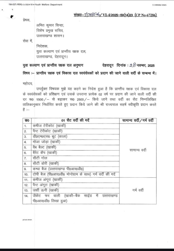 देहरादून, 28 नवंबर। प्रान्तीय रक्षक एवं विकास दल (पीआरडी) स्वयंसेवकों के लिए वर्दी भत्ते में वृद्धि की गयी है। अब वर्दी भत्ते के लिए हर 2 साल में ₹1500 के बजाय ₹2500 दिए जाएंगे। सर्दी और गर्मी के अलग-अलग यूनिफॉर्म सेट भी तय कर दिए गए हैं।